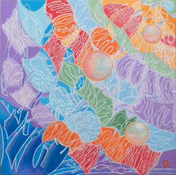 The light blue, green and purple tones of the painting, which is created on the theme of the second part of the concert, correspond to the calm serene mood of Romance: Larghetto. A romantic melody reminds of the beauty of nature and its perfection. The composition of this painting is a ball - a perfect natural form. What is it - a drop of rain on a leaf of a tree, which reflects the colors of the surrounding world? Or is it the whole globe basking in the sun's rays? The musical story of the picture begins on the left side of the ball, where a green stalk like a kind of umbilical cord grows from the ball. The store ends at the bottom, where a golden thread leads to the finale. The story is divided into eight pieces - eight segments of a ball. The smooth horizontal pattern of individual elements emphasizes the calm, romantic character of the music. In several places, horizontal lines intersect vertical lines, recalling the beautiful scale passages of the second part of the concert. The profile of the horizontal graphic elements corresponds to the musical phrases of the work, its two main musical themes, the development of which ends with an emotional finale.