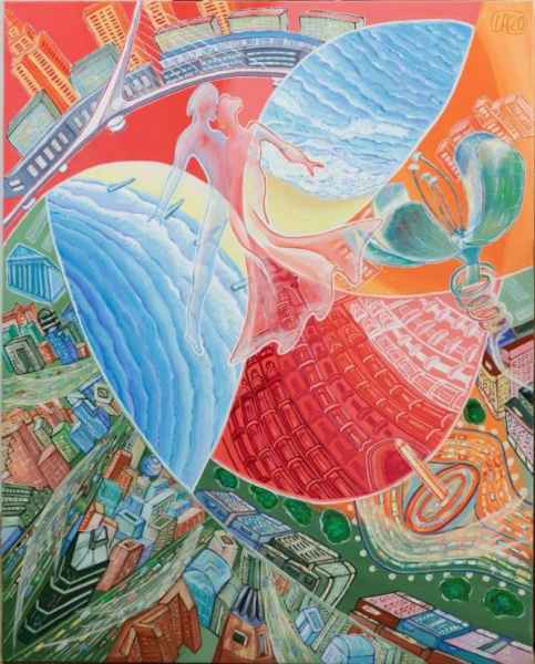 The picture "Spring in Buenos Aires" consists of three elements. The lower part is the kingdom of the green forest, whose cheerful voices and fresh breath symbolize rebirth and new hopes. The chirping of birds, the sound of a woodpecker on the trees- everything is hidden under the green tents of the trees. In the upper part of the painting, there is a traditional image of a thunderstorm with bright flashes of lightning and heavy purple thunderclaps. However, they do not frighten, but delight. A spring thunderstorm will quickly water the earth and stop. Between heaven and earth, a young man and a girl merged in a sensual tango. Passion is born, and possibly love.