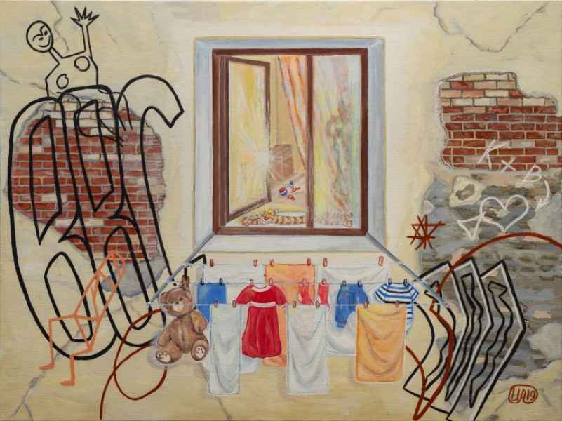 In her art project, Irina Akimova opposes the dysfunctional world of broken windows to the world of normal unbroken ones. There are unlucky destinies and crippled souls behind the broken windows. The hard look of a drunkard, which shows a fig to the whole world, speaks of inner bitterness ("Drunkard"). The cry of an old woman in a broken window is full of either hatred or despair (“Cry”). A woman with the fragments of broken sky above her head is the personification of grief ("Grief"). Each of them has own story, own disappointment, and own pain. The ruins of the church, which are visible through the bullet-punched window, constitute a part of the country's history. Broken windows do not provide the warmth and security that every person and all of us need.