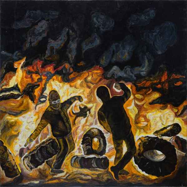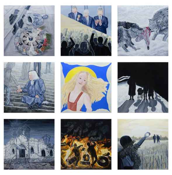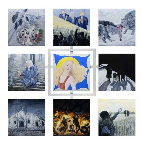 Eight psychological sketches surround the central portrait and reveal the story about risks and pains of the modern era. War, poverty, greed, hypocrisy and intolerance, as mortal sins, surround the image of Madonna. Each story has its own philosophical subtext. Black smoke of fire on the barricades ("Black angel of the barricades"), and the glare of the sun on the gun remind of true defenders of the Fatherland. But the price of social upheavals is very high. Dark female silhouettes on the background of the road ("Night waiting") radiate the uncertainty of expectations. Will their husbands and betrothed come back home? Through the window glass that is broken by a bullet we see the ruins of the church. How many human tragedies are buried there? Heroes and victims are inseparable. Let the sacrifices not be in vain. Let us build our future without victims.