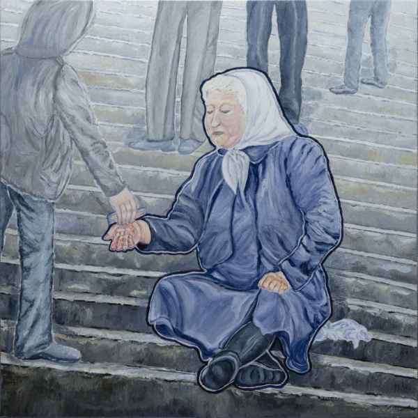 The old woman on the stairs with a begging hand ( “The shame of alms”) is a symbol for our Madonna’s future , for our own future, if the world is ruled by greed ("Wolves"), intolerance ("Pieces of History ") and hypocrisy ("People without a face"). The frame with the outlines of the cross around the portrait of the Ukrainian Madonna hints at her vulnerability and potential sacrifices, which might be necessary unless the society finds a peaceful solution ( constructive compromise) for the on-going conflicts. Why is the Madonna smiling? She believes that together we are able to regain harmony and move forward.
